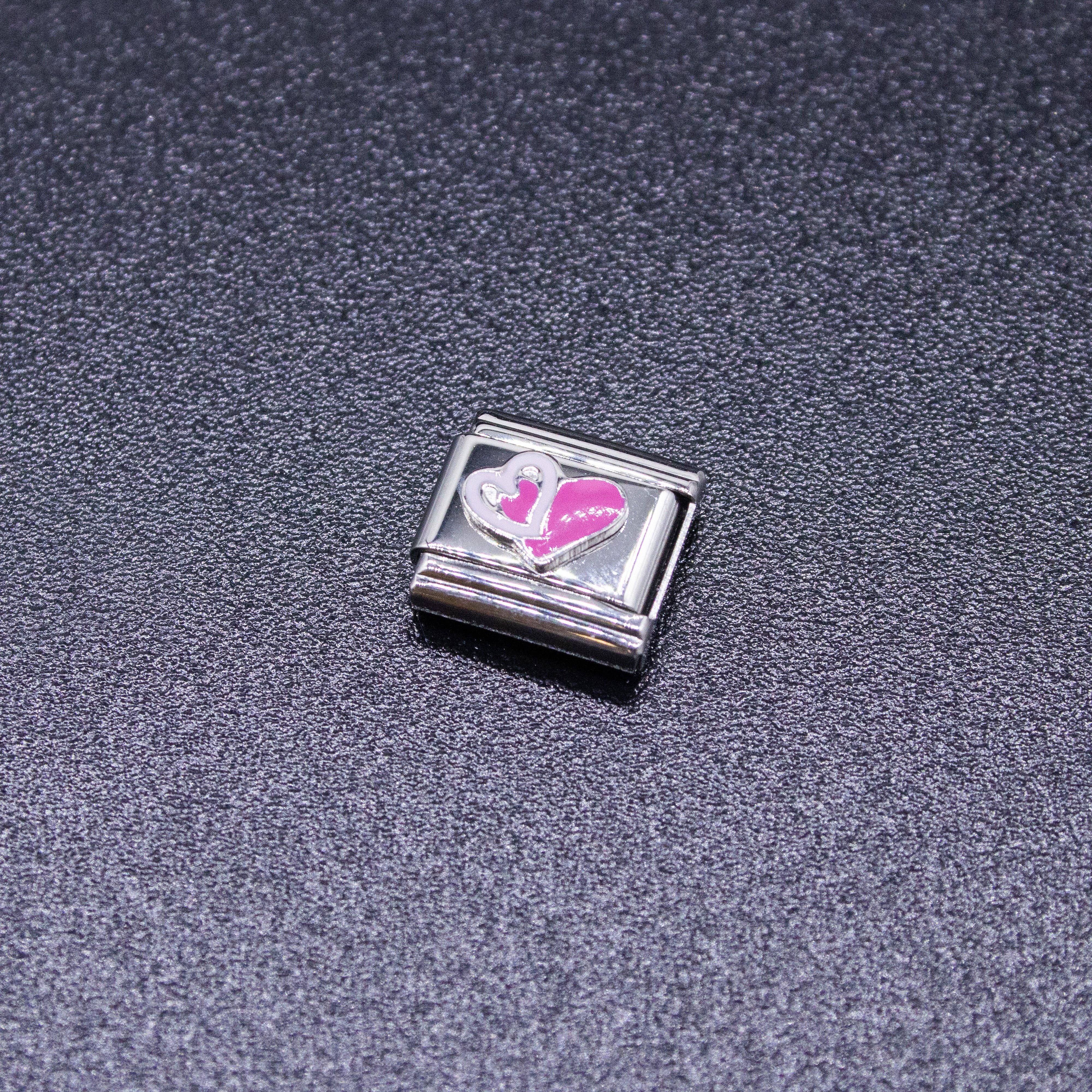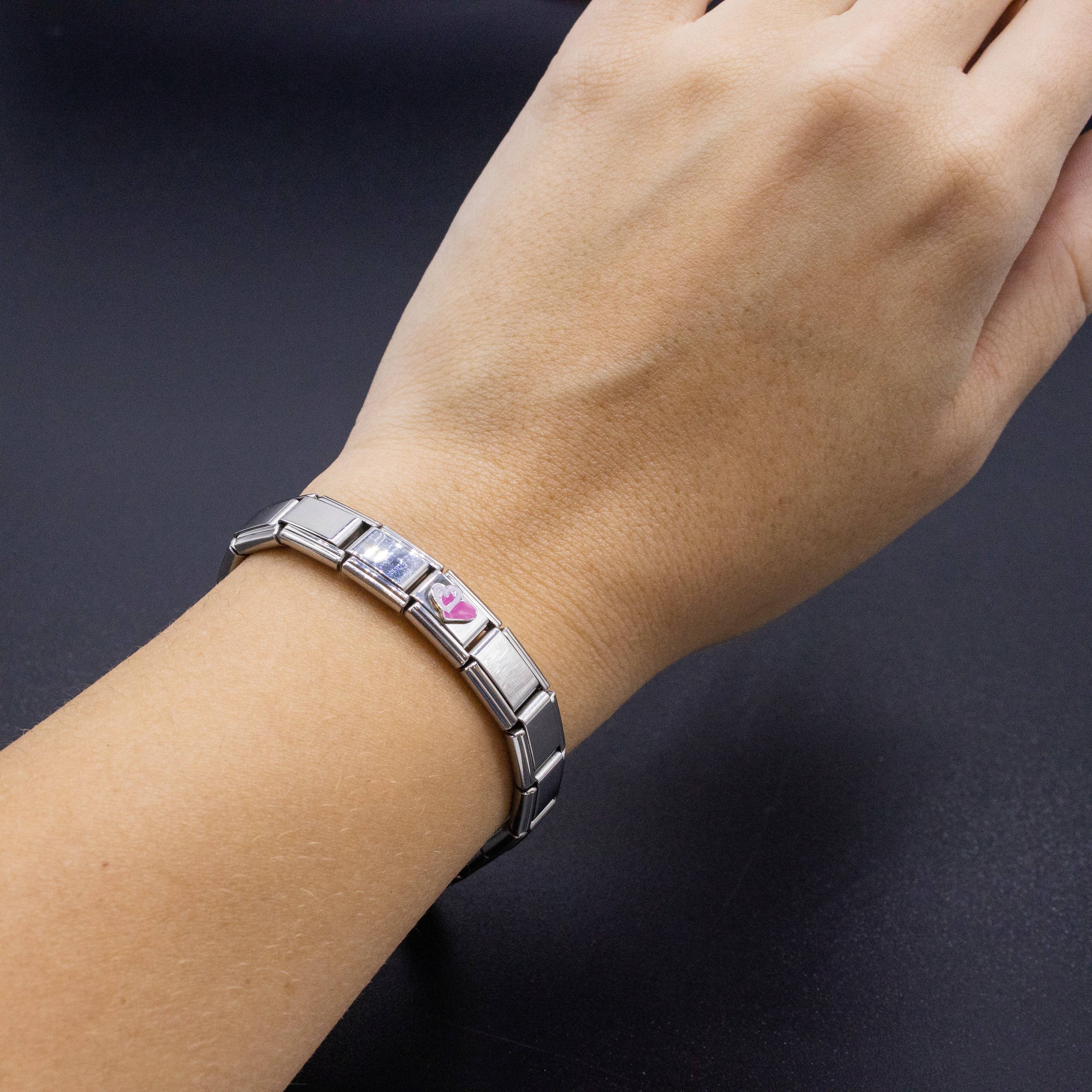 9mm Italian charms, compatible with any standard sized Italian square links bracelet; * Dimensions: 9mm length x 10mm width x 3mm height * Stainless steel charm with enamel Pink and White Heart Design * Charms for Women & Men
