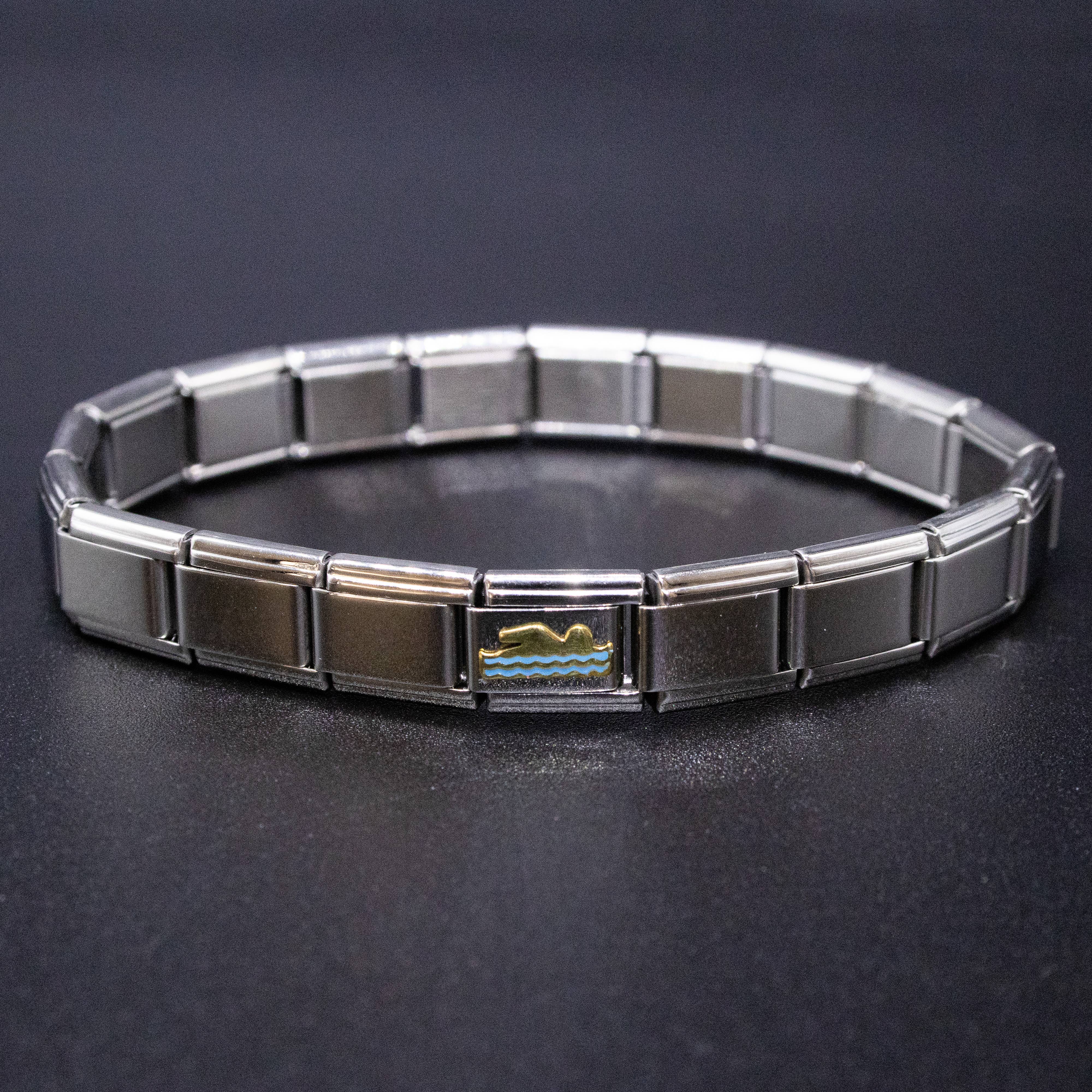 9mm Italian charms, compatible with any standard sized Italian square links bracelet * Dimensions: 9mm length x 10mm width x 2mm height * Stainless steel charms with a swimmer design * Swimming themed bracelet charms for teens and adults * Unisex Italian links for women and men