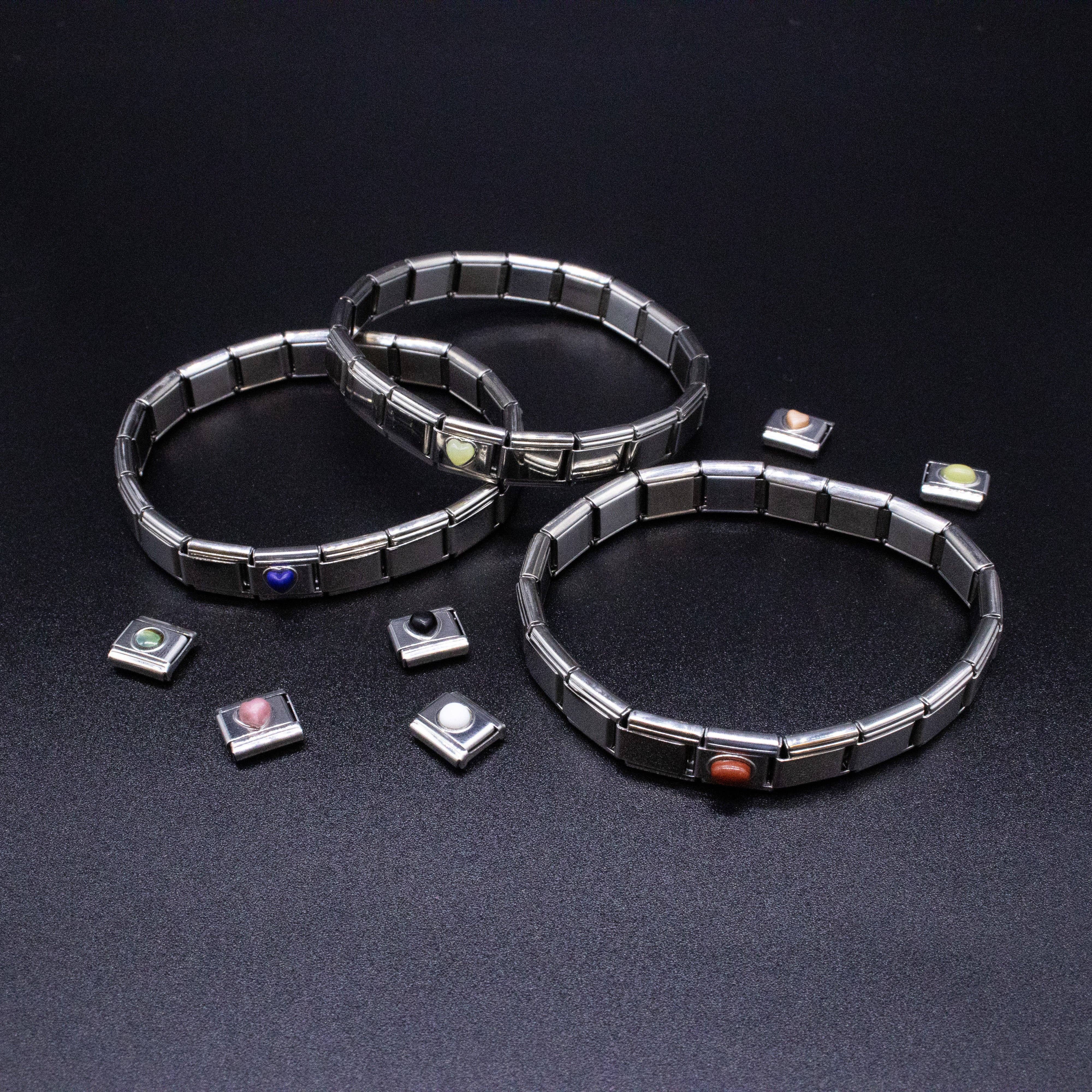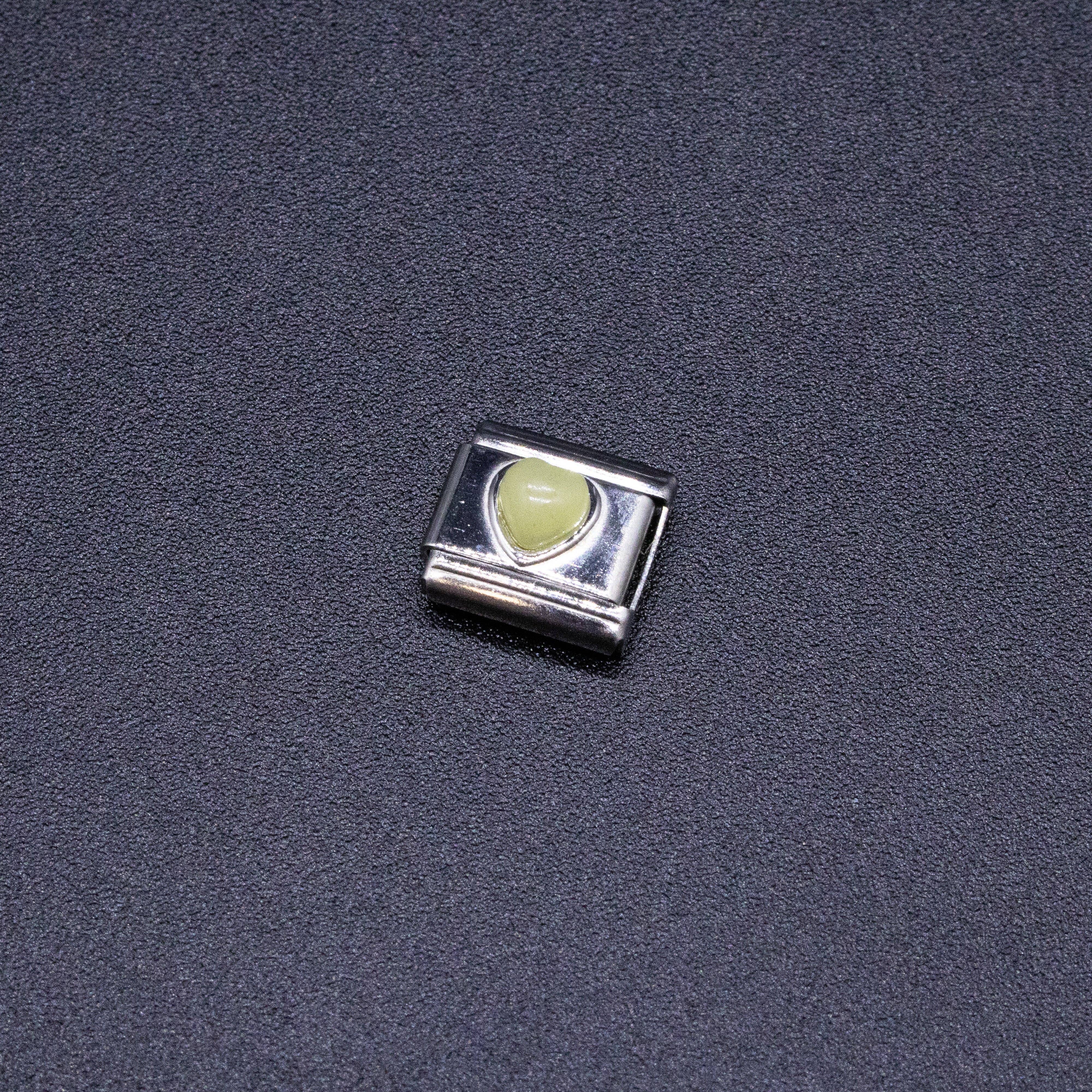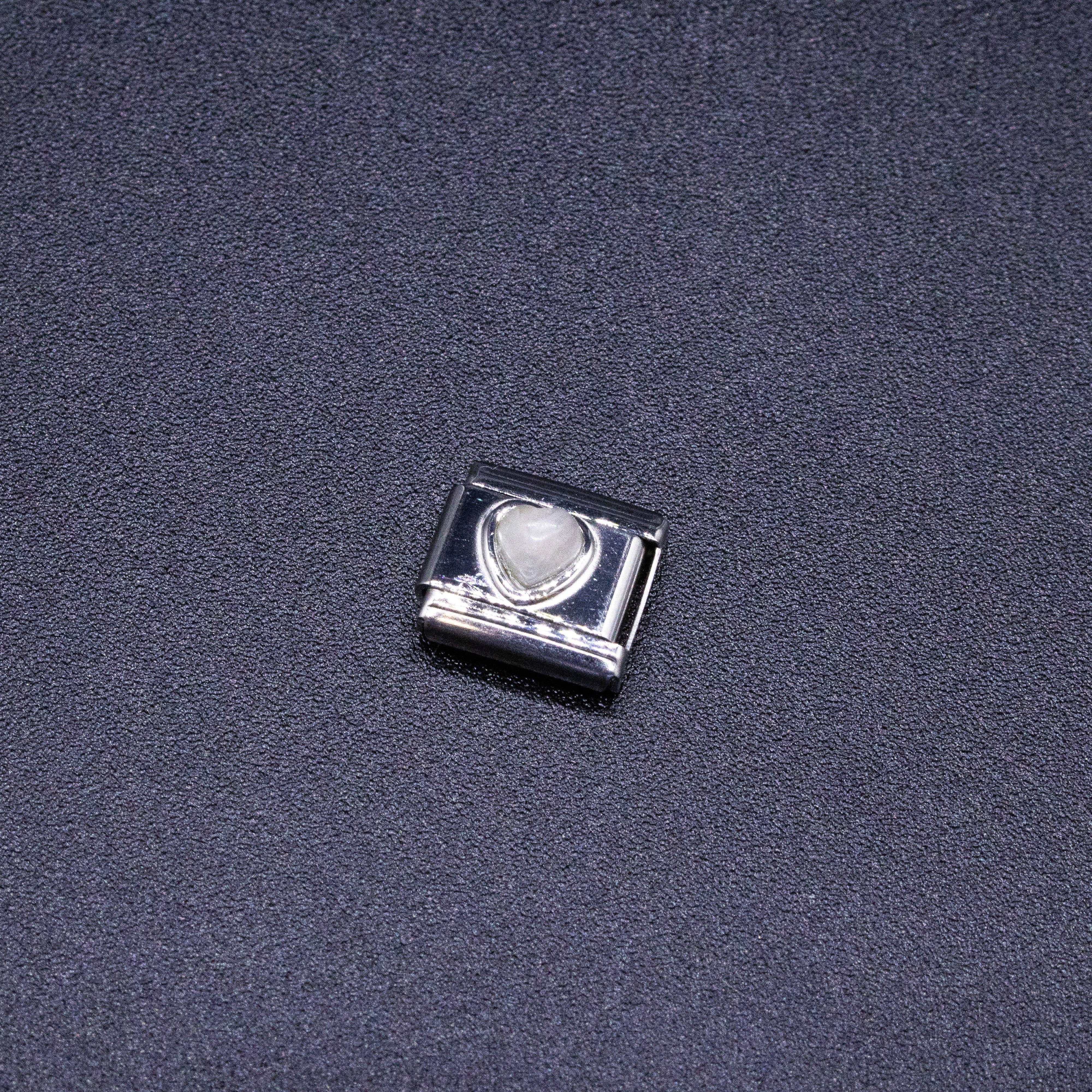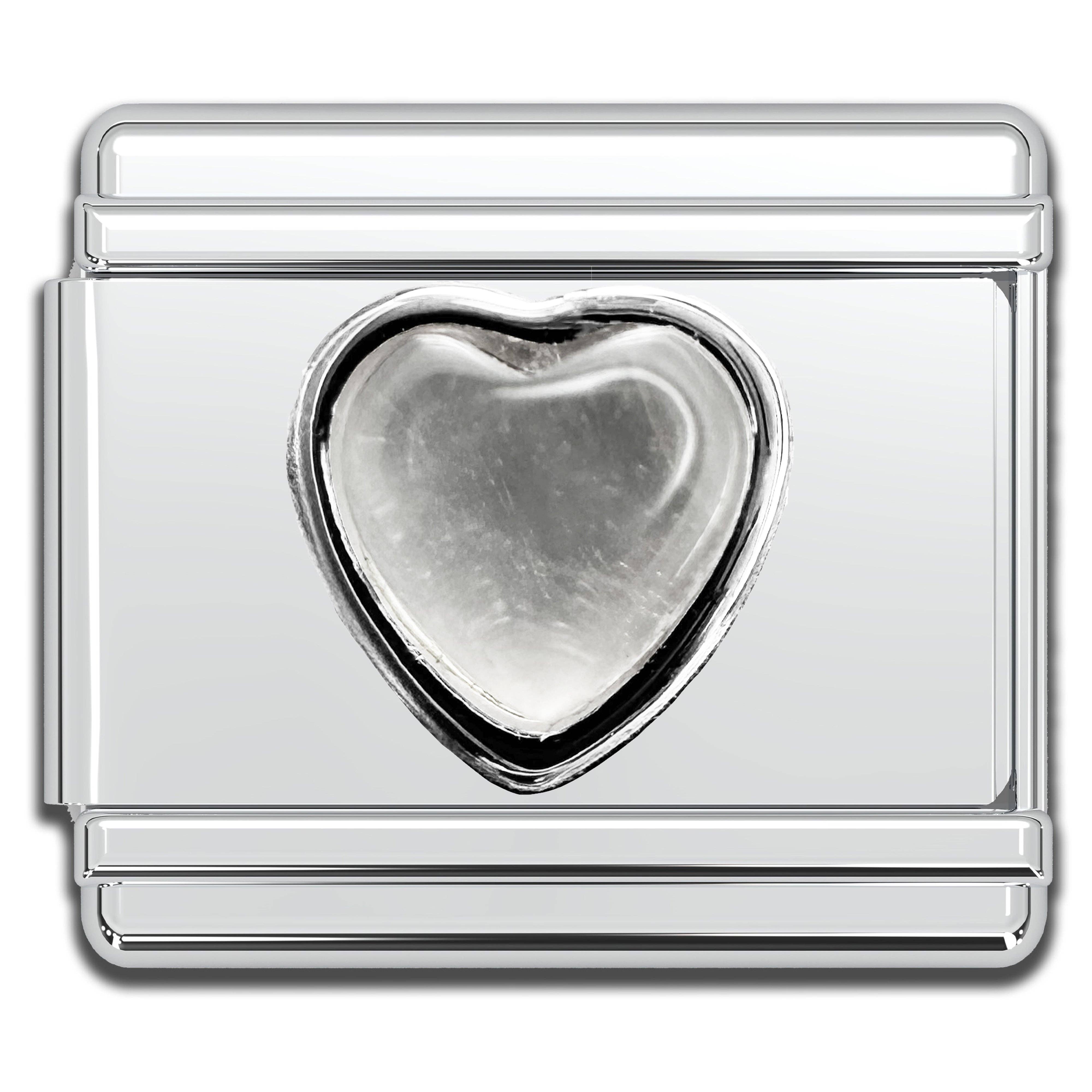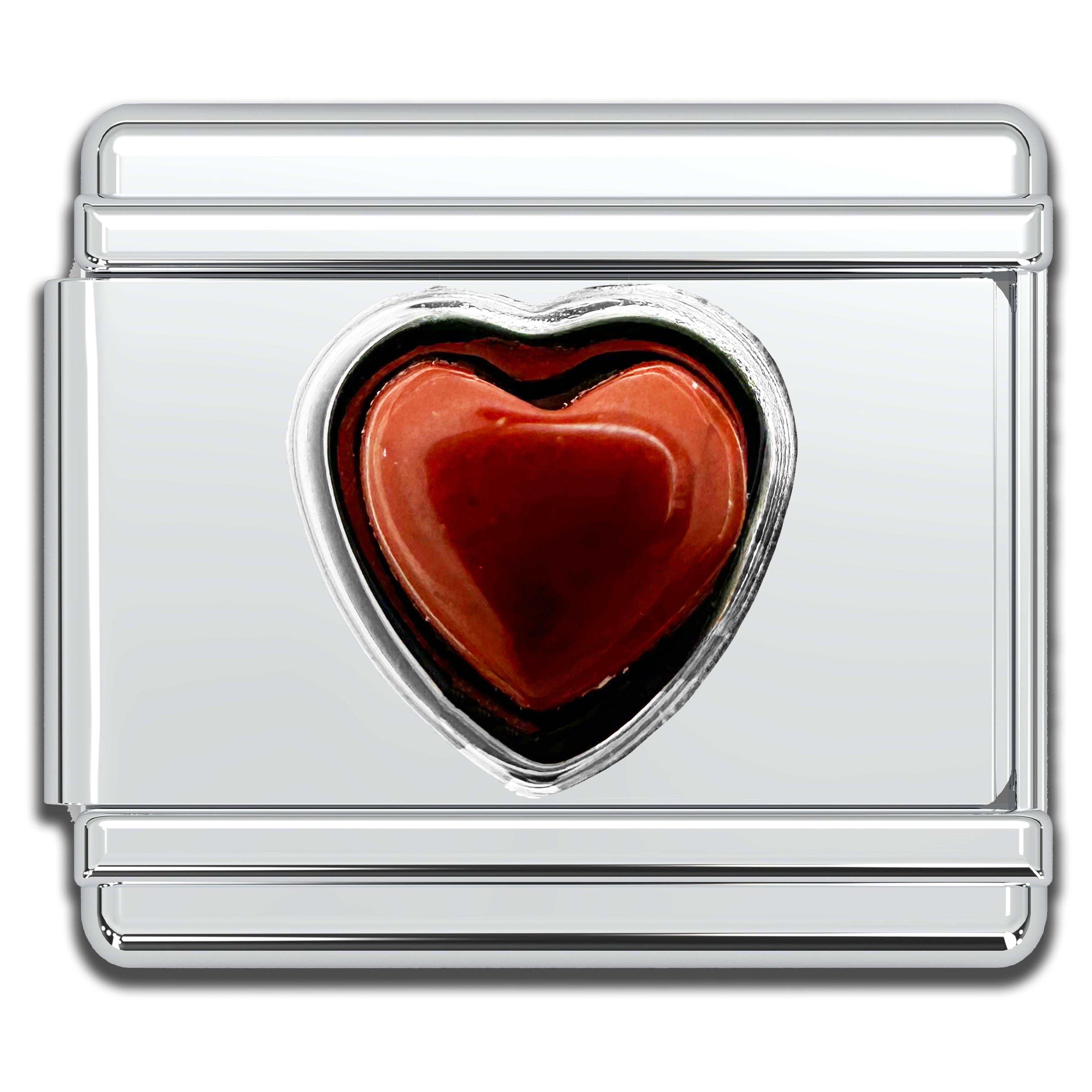 9mm Italian charms, compatible with any standard sized Italian square links bracelet * Dimensions: 9mm length x 10mm width x 3mm height * Stainless steel charms with natural semiprecious heart shaped gemstones * Available Crystals: pink jade, cream jade, onyx, quartz, turquoise, red jasper, lapis, or carnelian * Crystal healing chakra themed bracelet charms for teens and adults * Unisex Italian links for women and men