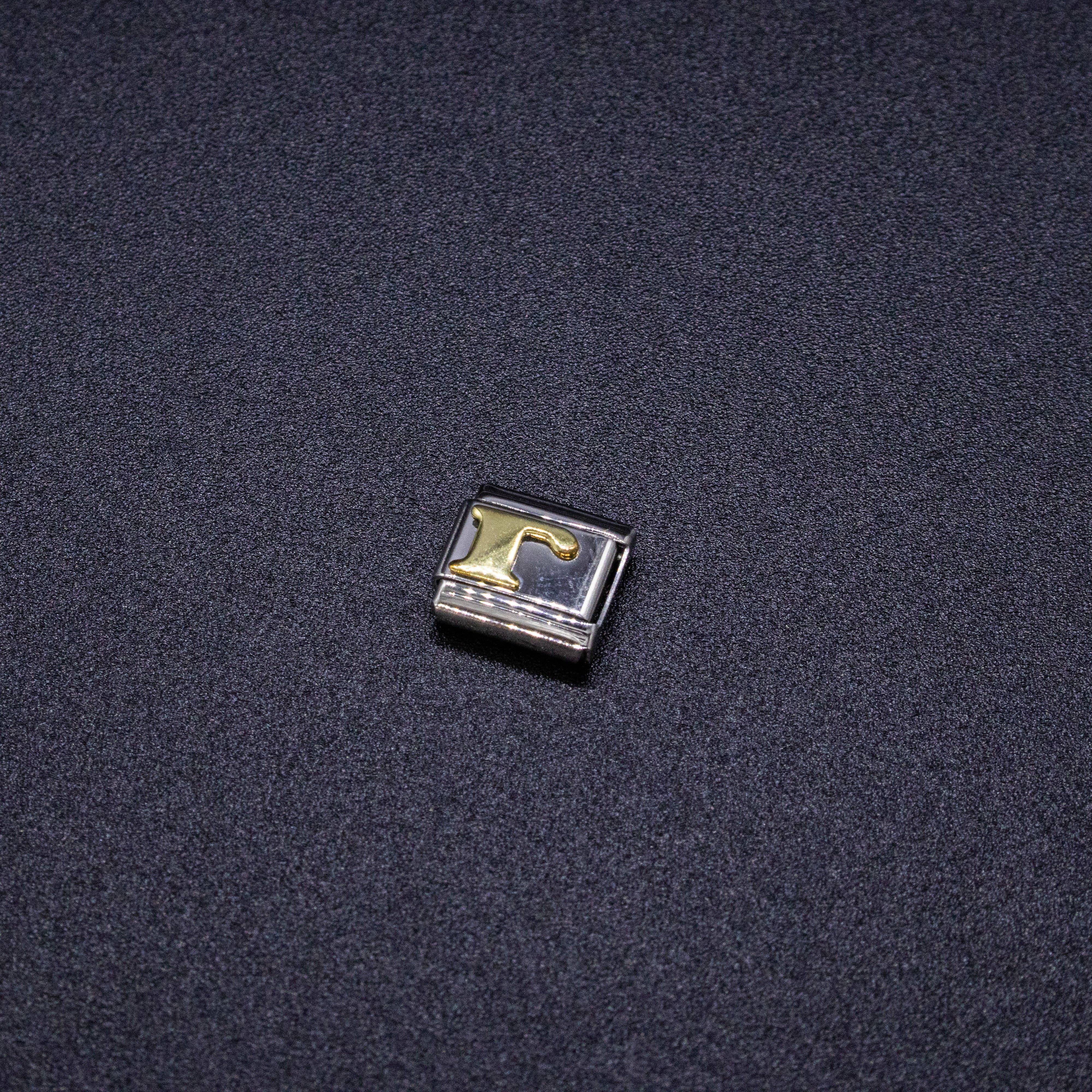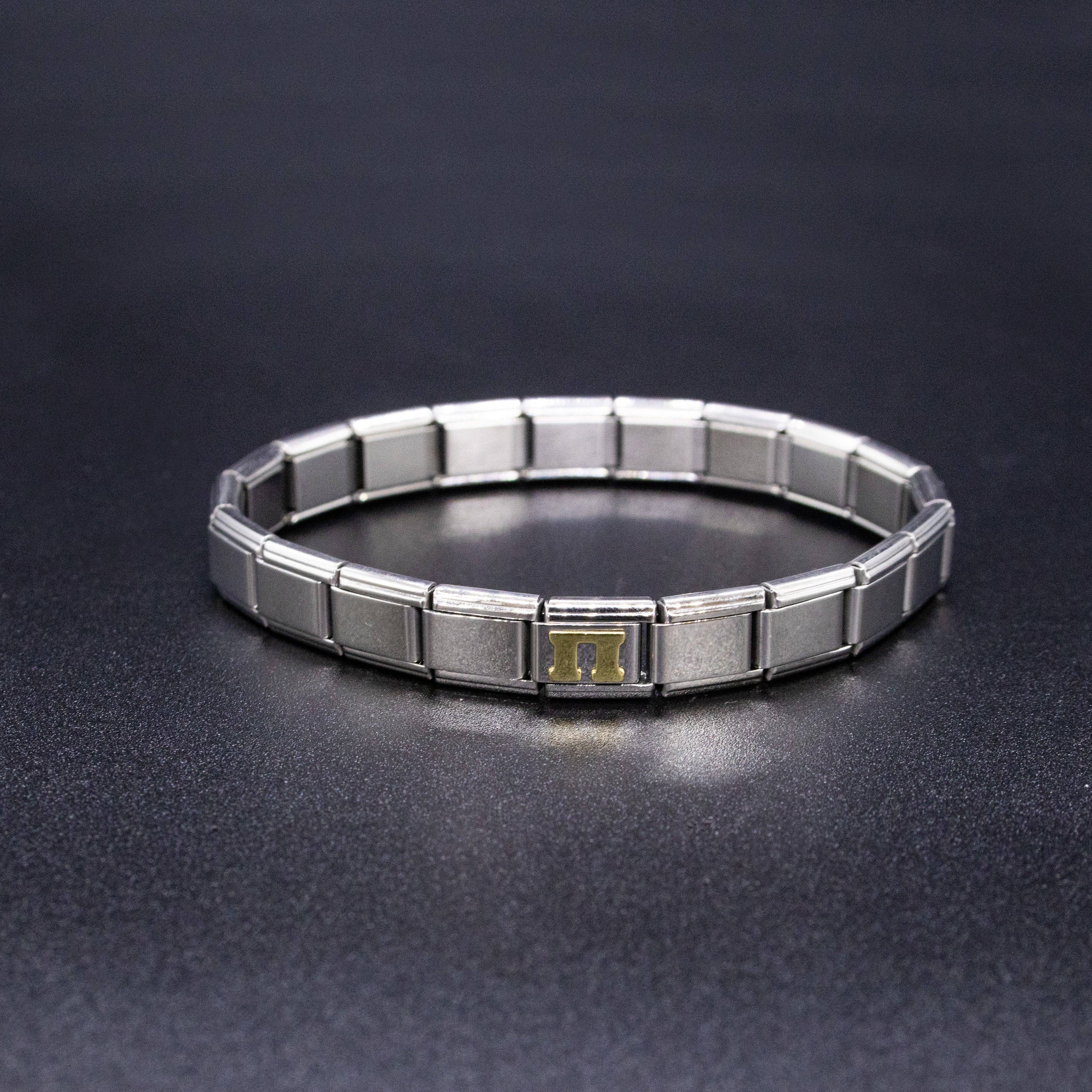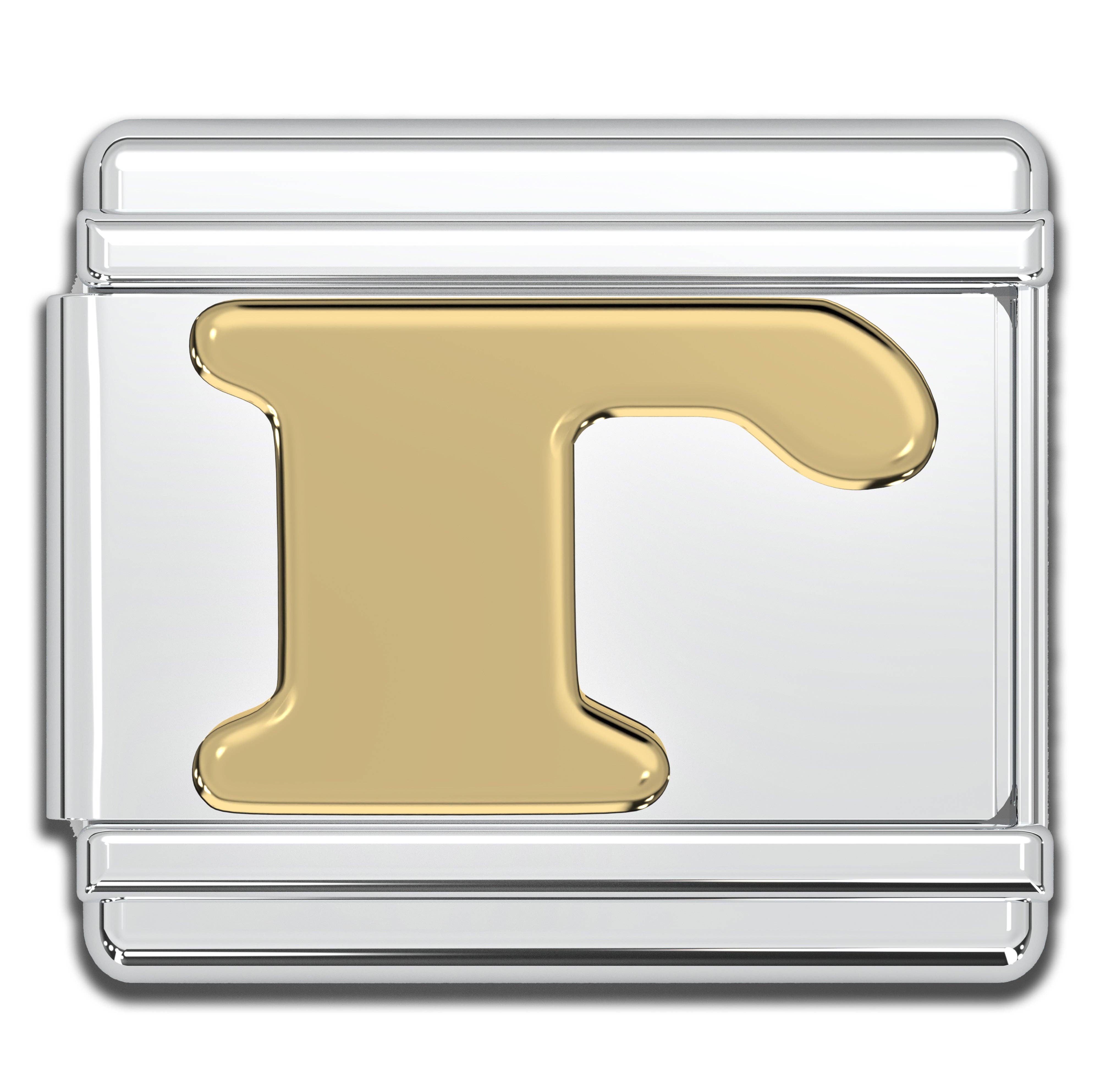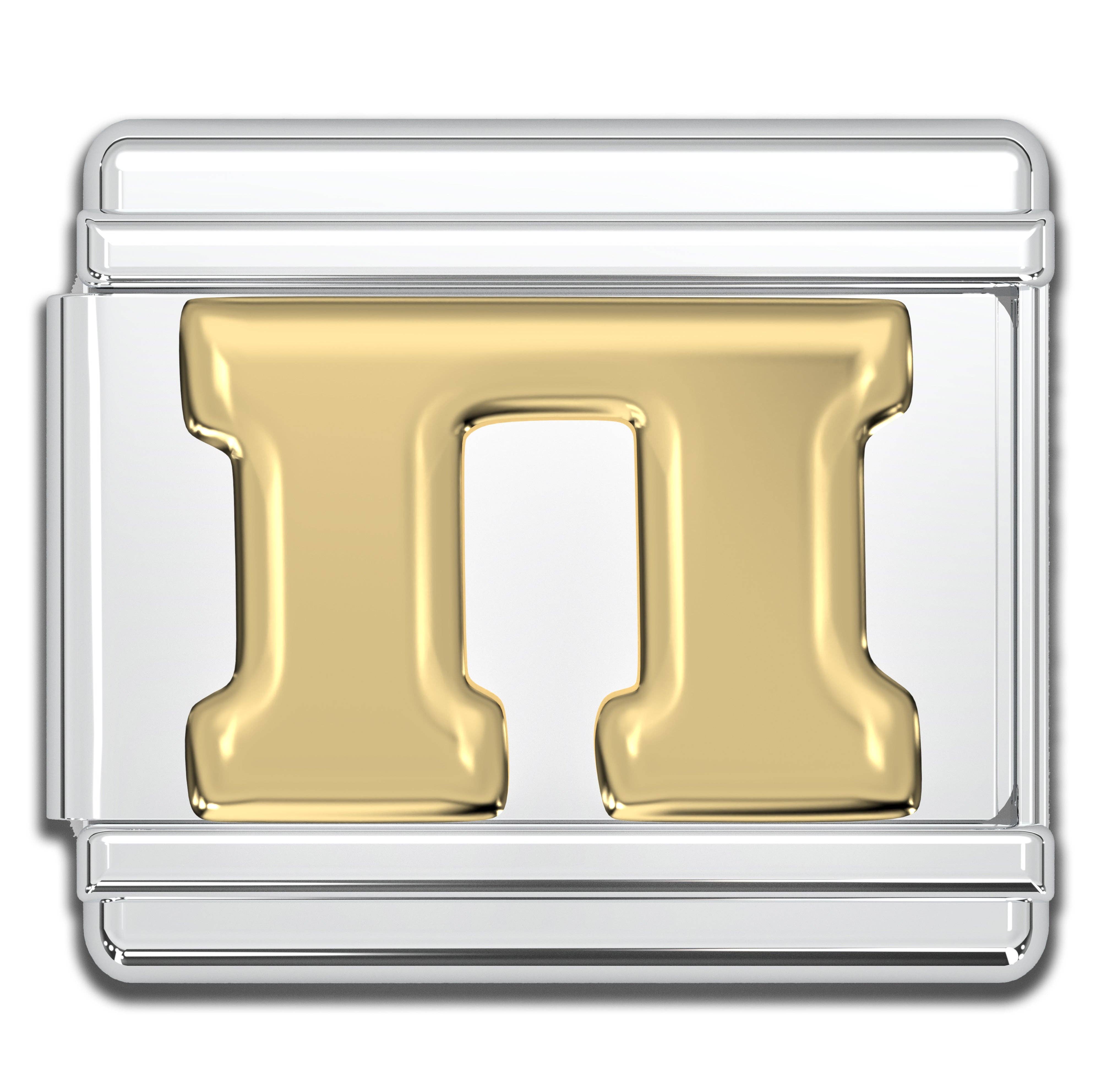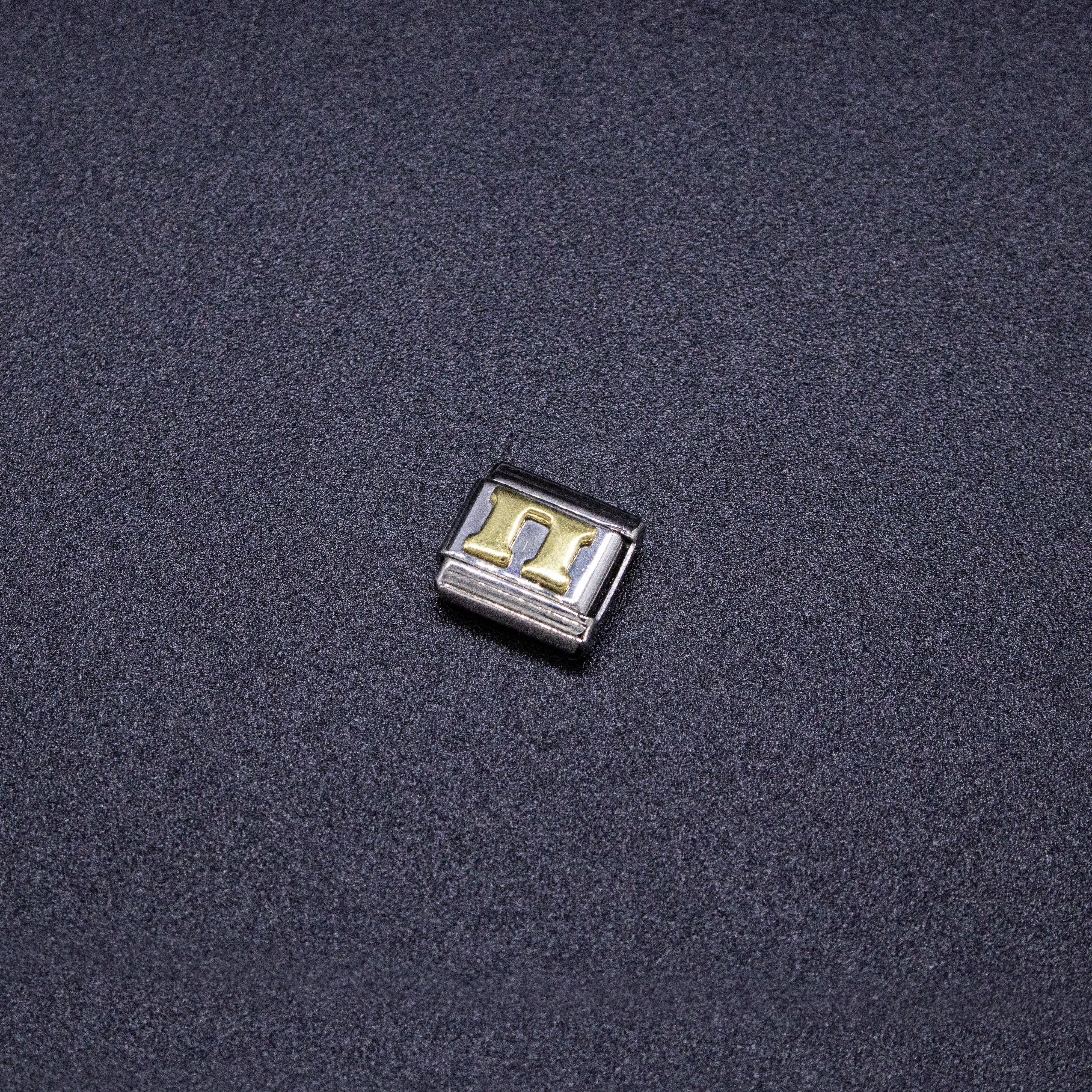 9mm Italian charms, compatible with any standard sized Italian square links bracelet * Dimensions: 9mm length x 10mm width x 2mm height * Stainless steel charms with a raised gold Greek alphabet letter design * Available letters: Gamma, Delta, Theta, Lambda, Xi, Pi, Sigma, Phi, Psi, Omega * Fraternity and sorority themed bracelet charms for teens and adults * Unisex Italian links for women and men