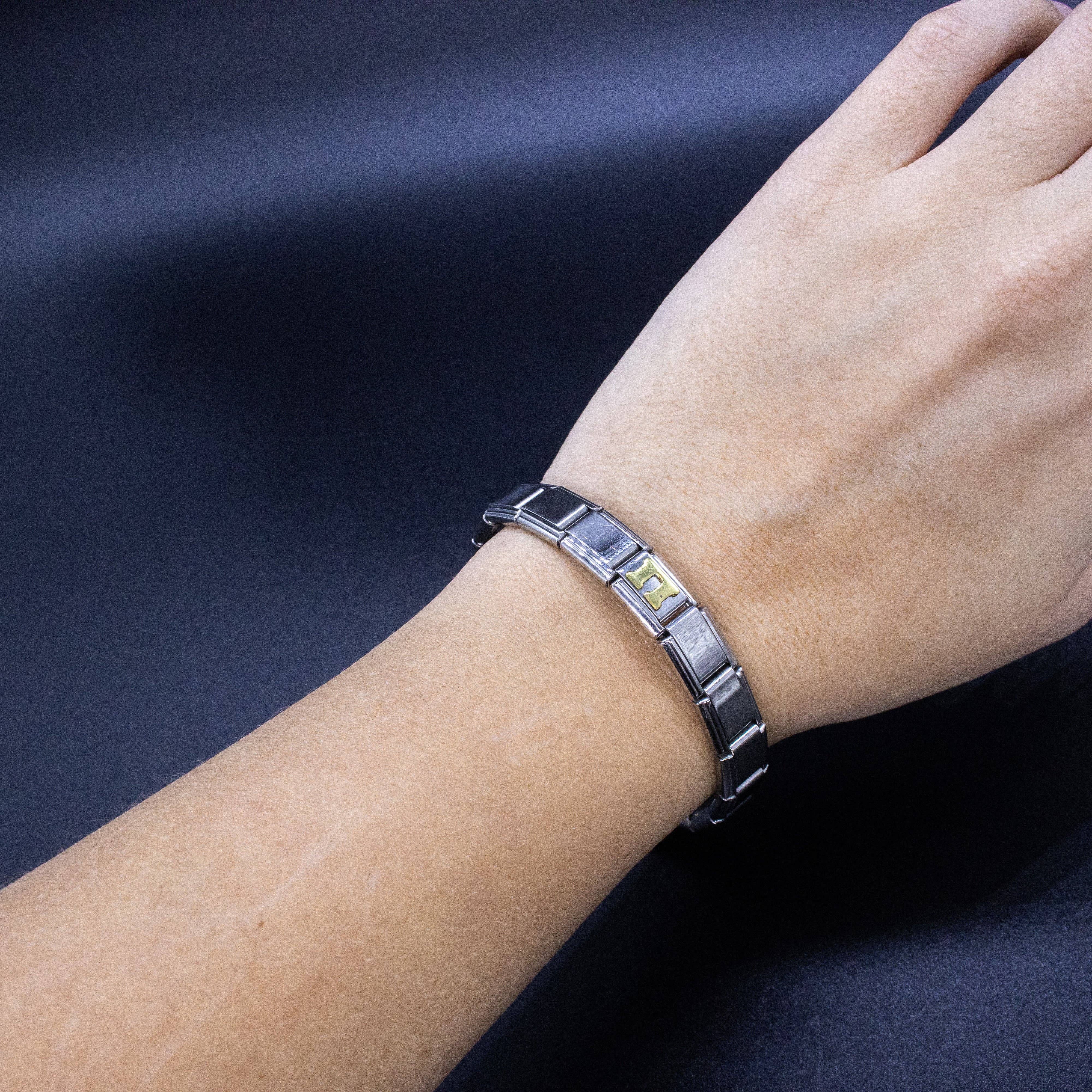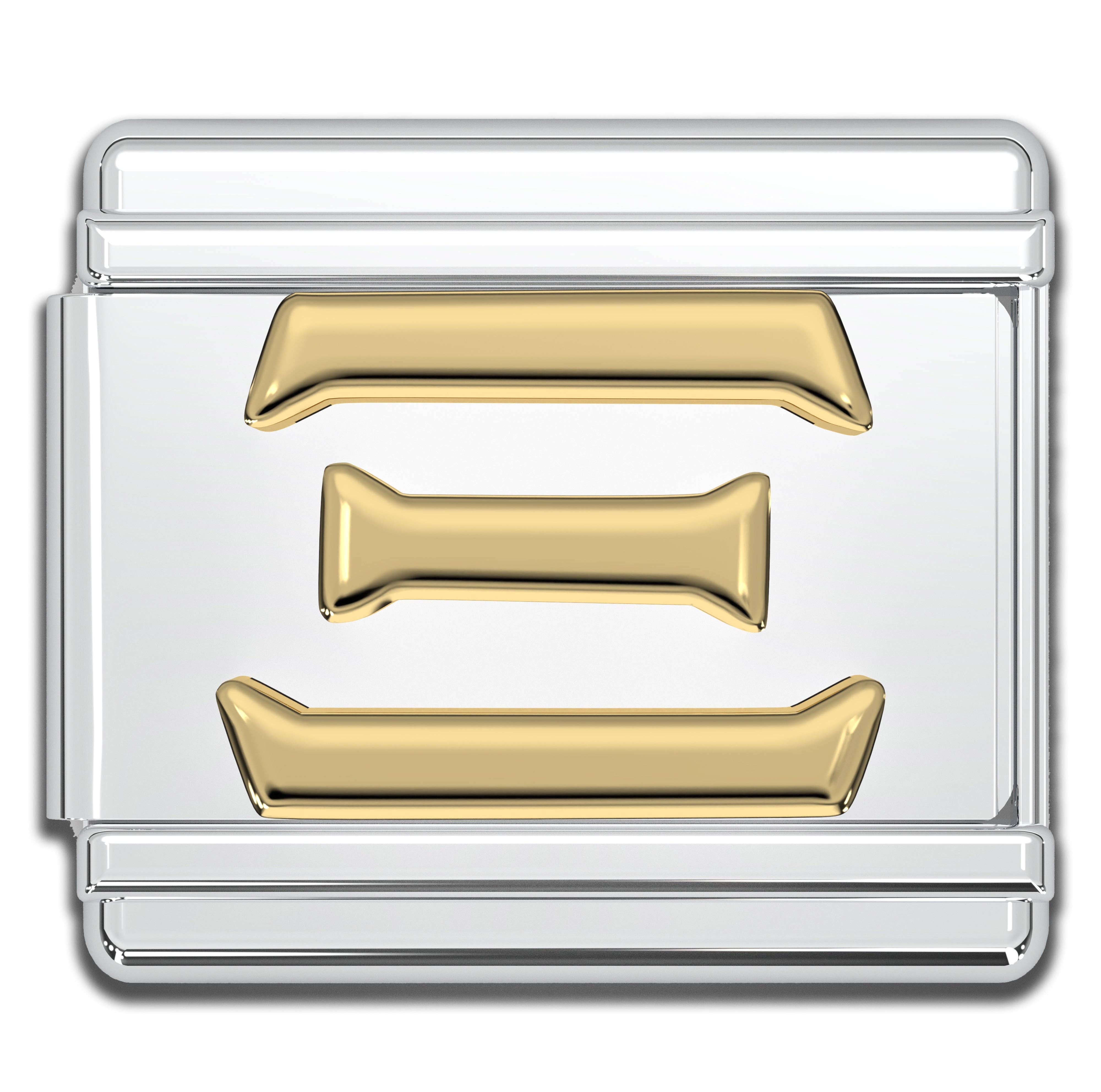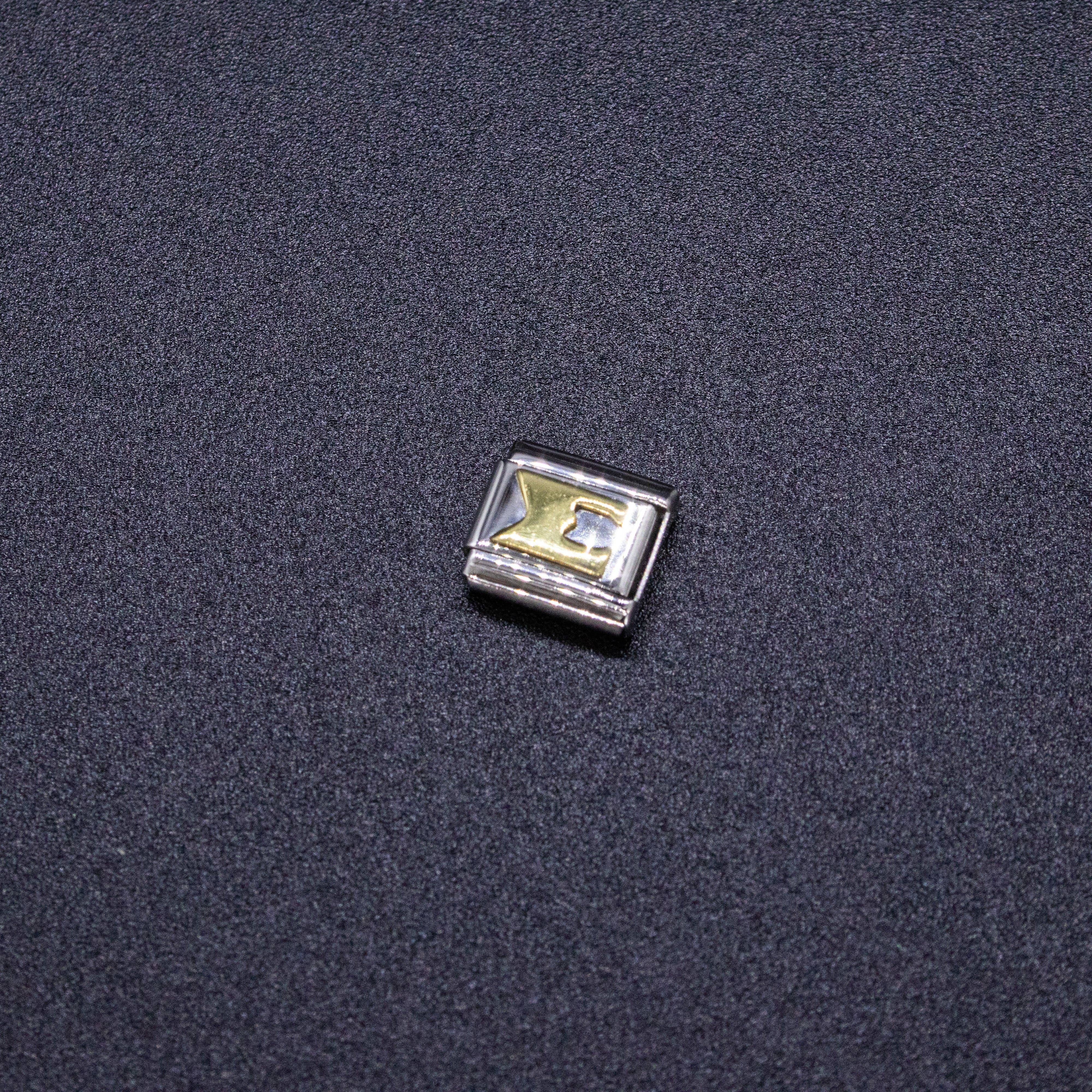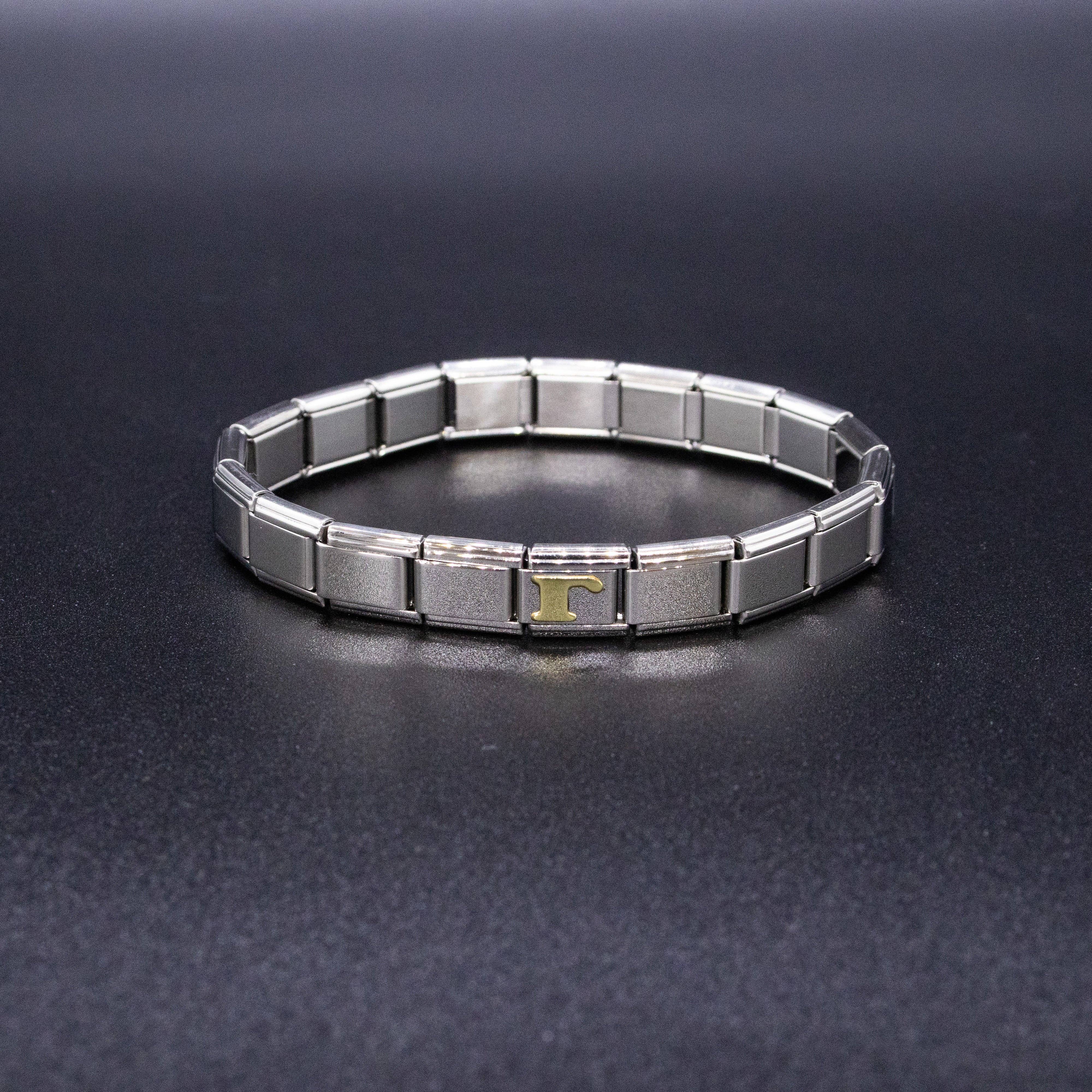 9mm Italian charms, compatible with any standard sized Italian square links bracelet * Dimensions: 9mm length x 10mm width x 2mm height * Stainless steel charms with a raised gold Greek alphabet letter design * Available letters: Gamma, Delta, Theta, Lambda, Xi, Pi, Sigma, Phi, Psi, Omega * Fraternity and sorority themed bracelet charms for teens and adults * Unisex Italian links for women and men