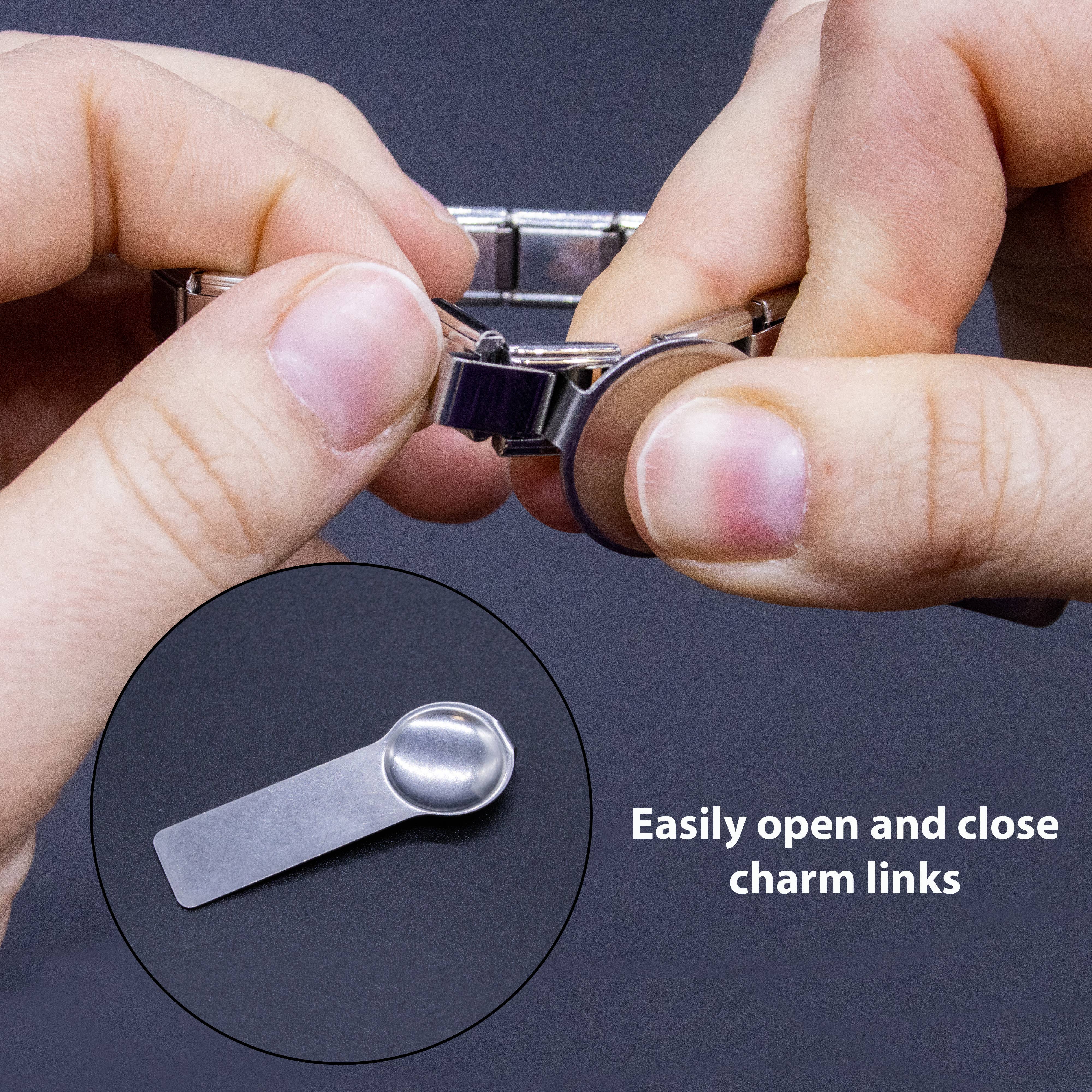 Italian charm bracelet tool for charms * Made of durable stainless steel * Measurements: 2.25 inches long by 0.75 inches wide * Use this tool to easily open and close Italian style links for an Italian charm bracelet * Fits standard 9mm Italian charms.